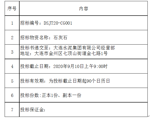 2.項(xiàng)目說(shuō)明:大連水泥集團(tuán)有限公司組織對(duì)大連水泥廠原燃材料石灰石采購(gòu)項(xiàng)目進(jìn)行邀請(qǐng)招標(biāo)。凡接到本招標(biāo)邀請(qǐng)的廠商均可參加投標(biāo)。